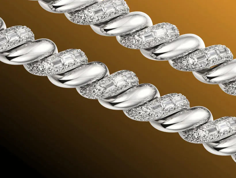 Introducing the Flat Pave Valentina Chain in White Gold. These connected Valentina links are fully iced in pave hand-set stones, designed to catch the light from every direction. Crafted with high-quality 14k White Gold, this chain offers both durability and luxury. Stack it or wear it solo for the perfect drip that will upgrade your fit!